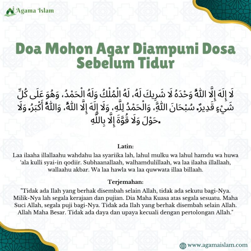 Di dalam ajaran Islam, banyak amalan yang bisa kita lakukan untuk mendekatkan diri kepada Allah SWT, salah satunya adalah dengan membaca doa sebelum tidur. Doa ini tidak hanya memberikan ketenangan batin, tetapi juga menjadi salah satu bentuk permohonan ampunan kepada Allah SWT atas dosa-dosa yang telah kita lakukan. Salah satu doa yang diajarkan oleh Rasulullah SAW untuk dibaca sebelum tidur adalah doa mohon agar diampuni dosa yang diriwayatkan dalam hadits.