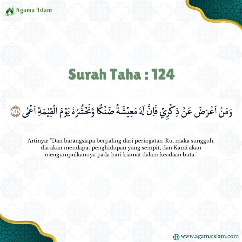 Artinya: “Dan barangsiapa berpaling dari peringatan-Ku, maka sungguh, dia akan mendapat penghidupan yang sempit, dan Kami akan mengumpulkannya pada hari kiamat dalam keadaan buta.”