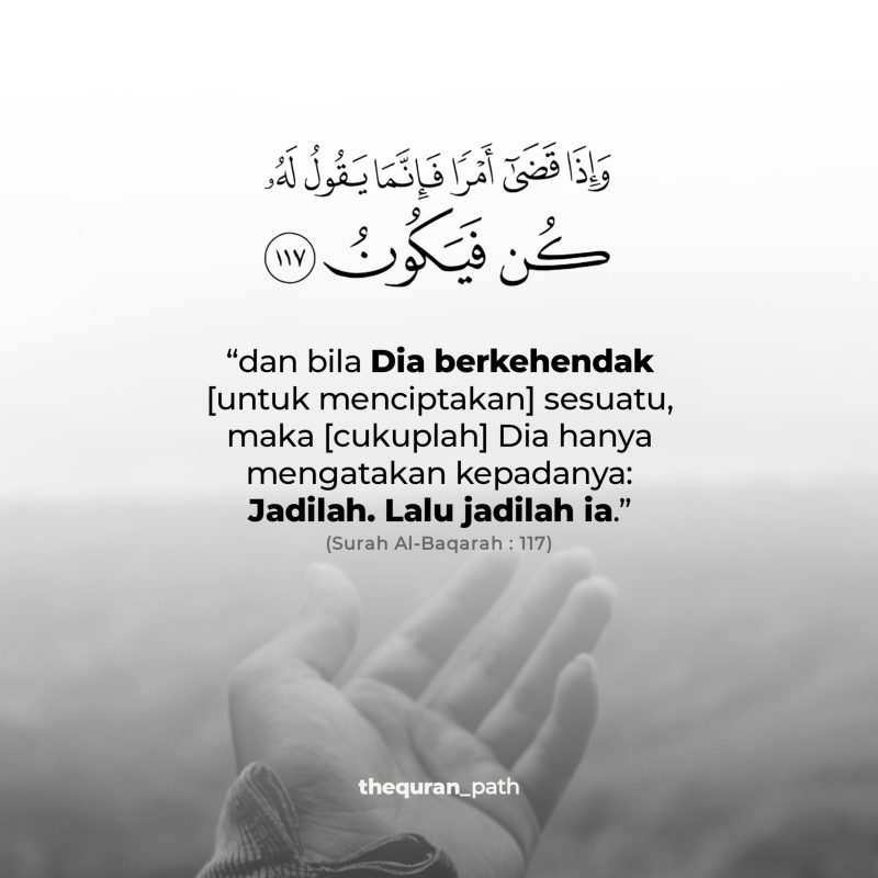 “Allah Pencipta langit dan bumi. Apabila Dia hendak menetapkan sesuatu, Dia hanya berkata kepadanya: ‘Jadilah!’ Maka jadilah sesuatu itu.” (QS. Al-Baqarah: 117)